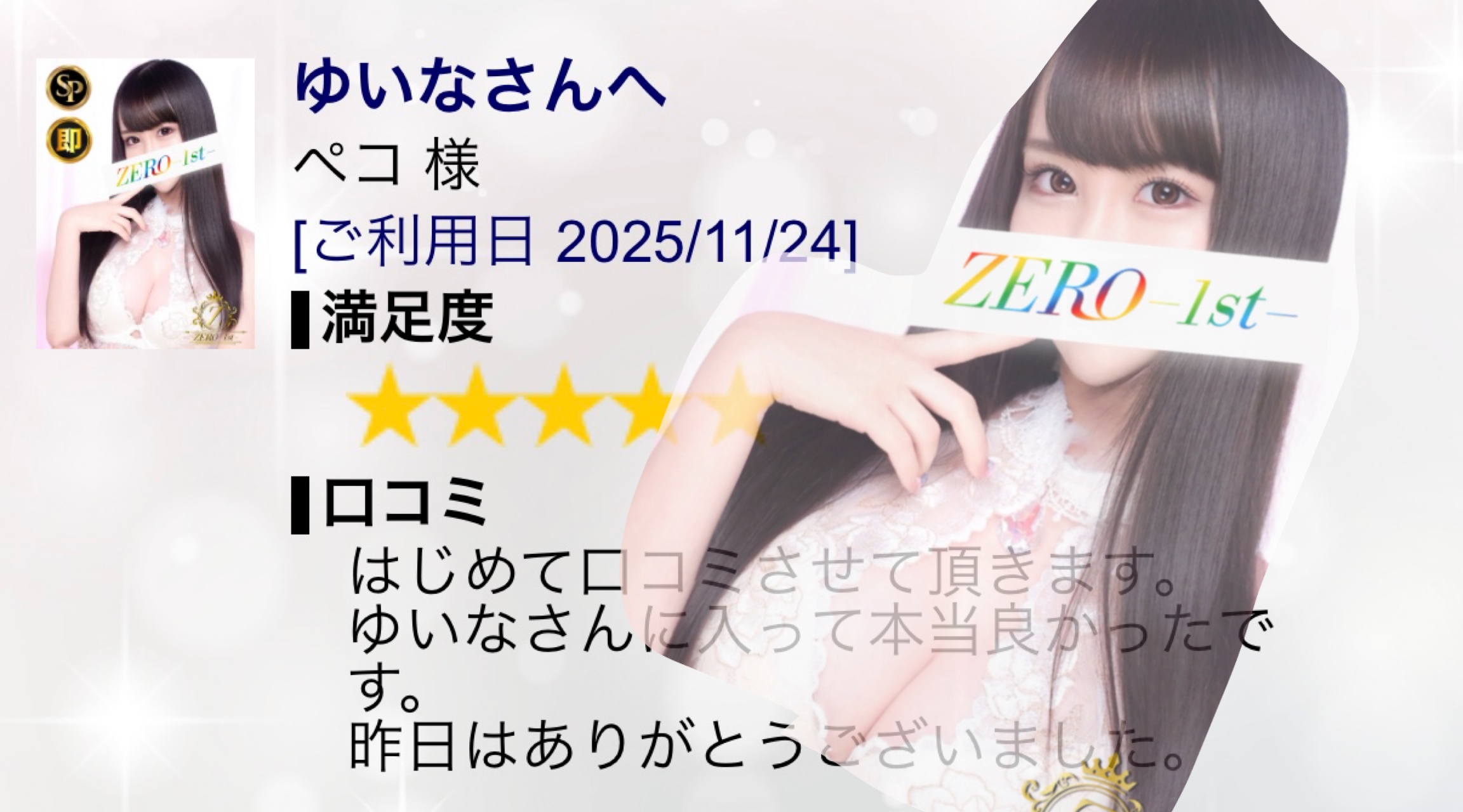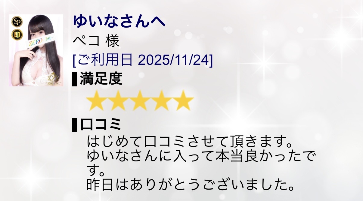 ❤️口コミ❤️ 2025/11/25 22:54:34 ペコ様♡口コミありがとうございます🩵初めての口コミが私で嬉しいです😭🩷書くのって面倒だと思うから😭ありがとうございます!!そして私と過ごしてよかったって思ってもらえてはっぴーです💓こちらこそありがとう꒰ ¨̮͚ ꒱♪ْ︎˖⋆︎