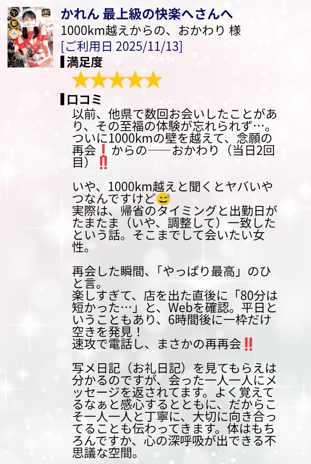 でもでもSくんの慣れてないから…は全然そんなの感じなくて、とっても気持ち良くしてくれたから♡かれんも最高のお時間過ごせたよ☺️