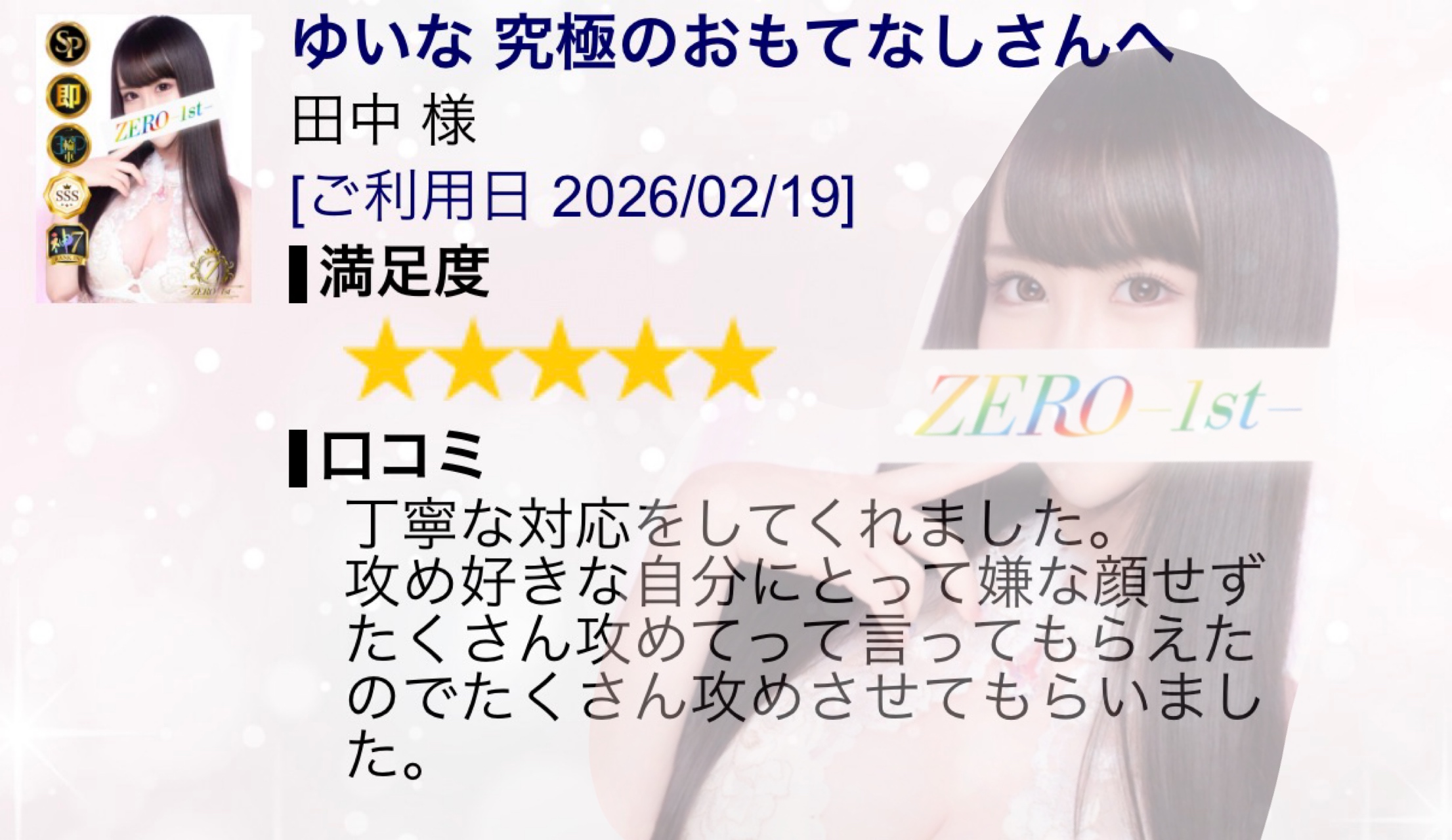 ❤️口コミ❤️ 2026/03/19 02:26:41 田中様♡口コミありがとうございます💓丁寧な対応したのは丁寧に接してくれるからだよ❤︎*.(๓´͈ ˘ `͈๓).*❤︎ヤりたいことヤる時間だからね🩷一方的な感じじゃないし優しく攻めてもらえて気持ちよかったよん♡もちろんお返しもしたけどね!!口コミ書くねって言ってたけど本当に書いてくれてありがとう🌸